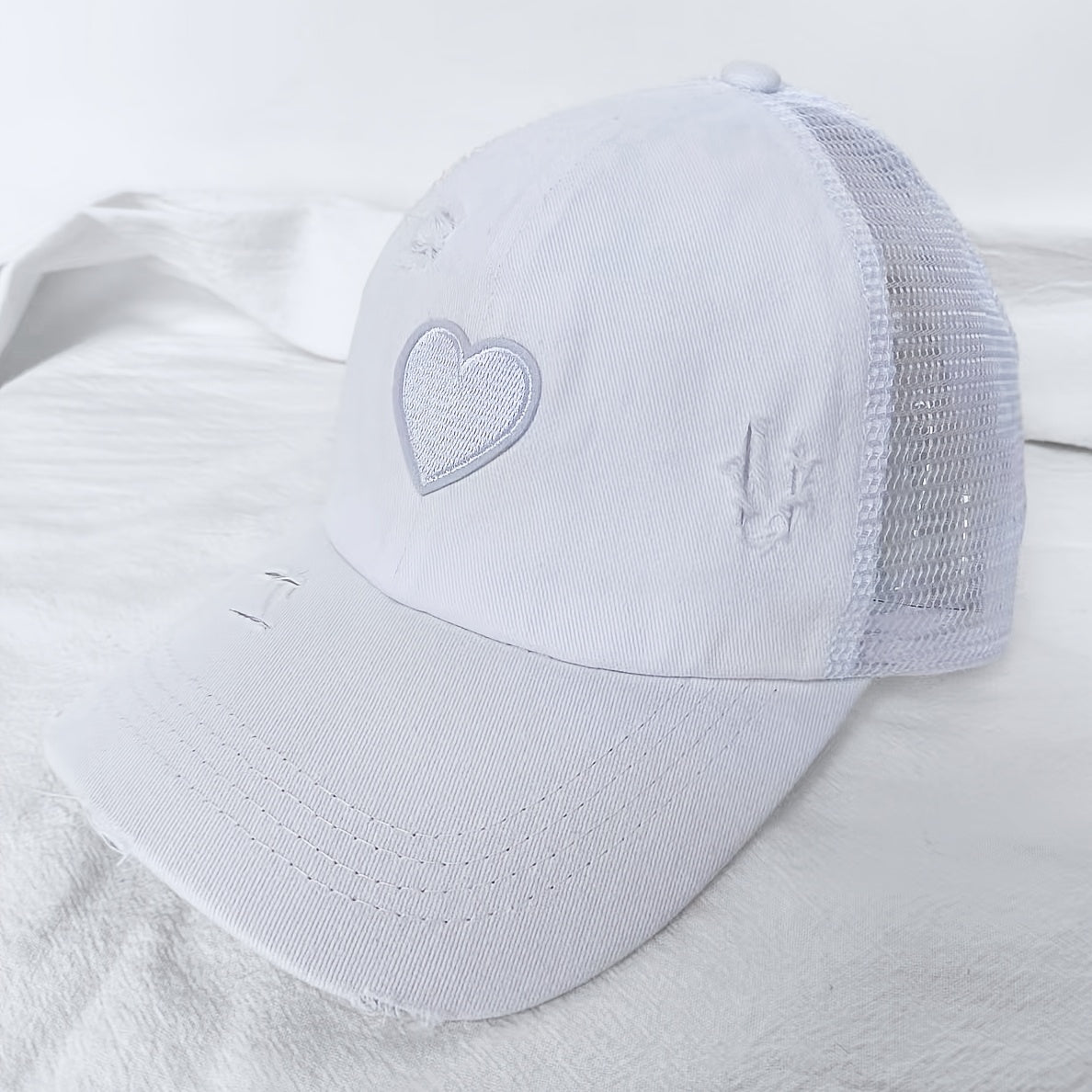 Casual, stoer en met een vrouwelijke twist – de Noor – Verweerde Truckerpet met Hartdetail is dé perfecte pet voor zonnige dagen, sportieve uitjes of als stoere finishing touch bij je outfit. Het gewassen, licht versleten effect geeft de pet een vintage uitstraling, terwijl het hartborduursel zorgt voor een speels accent.