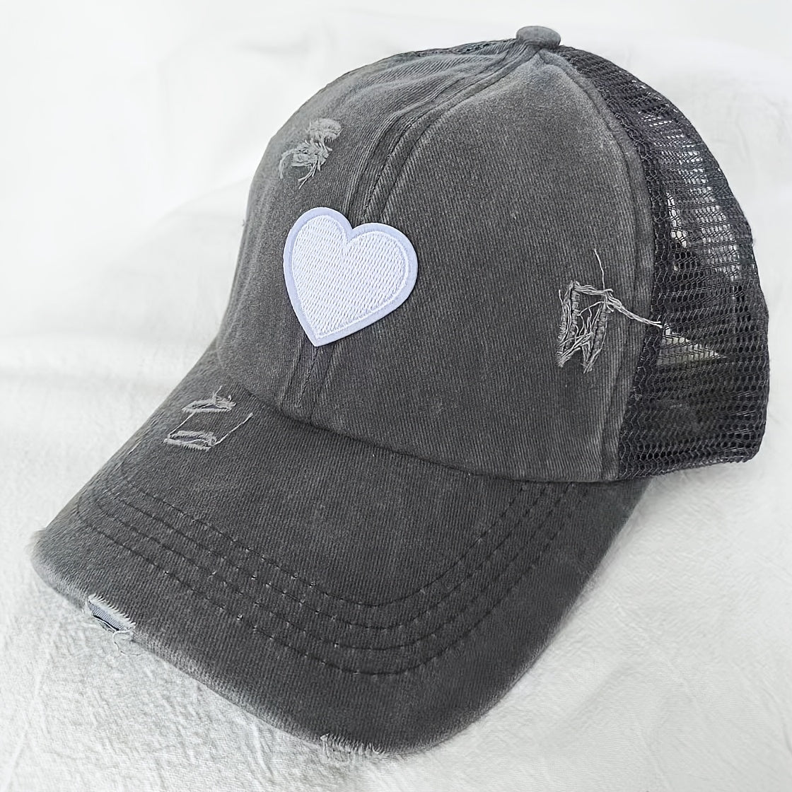 Ga voor stijl met karakter – ontdek de Noor – Verweerde Truckerpet met Hartdetail en geef elke outfit een coole finishing touch.